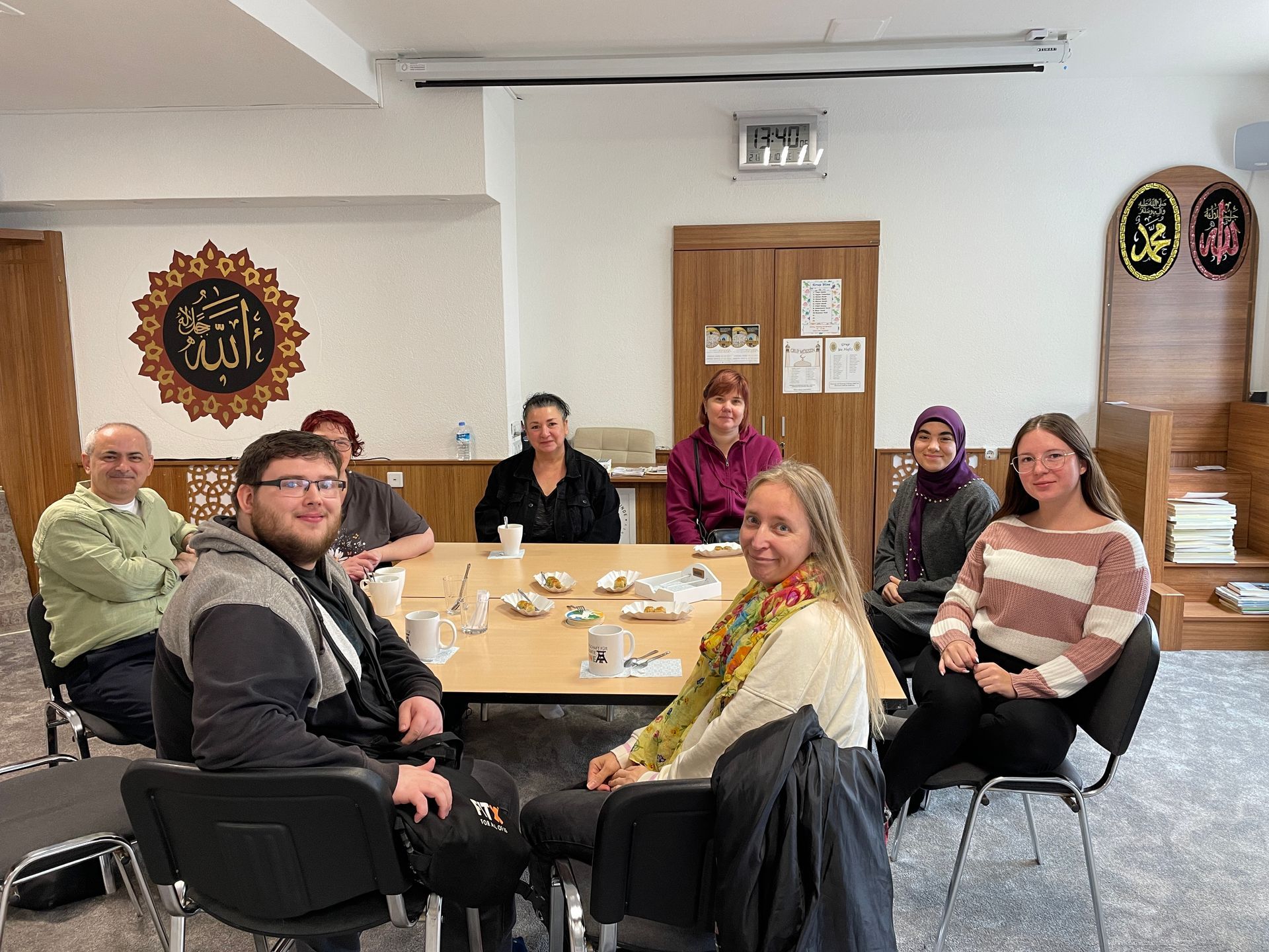 Bei Baklava und Kaffee wurden interessante Gespräche geführt, die Räumlichkeiten der Gemeinde erkundet und knapp zwei Tonnen Hilfsgüter verteilt.