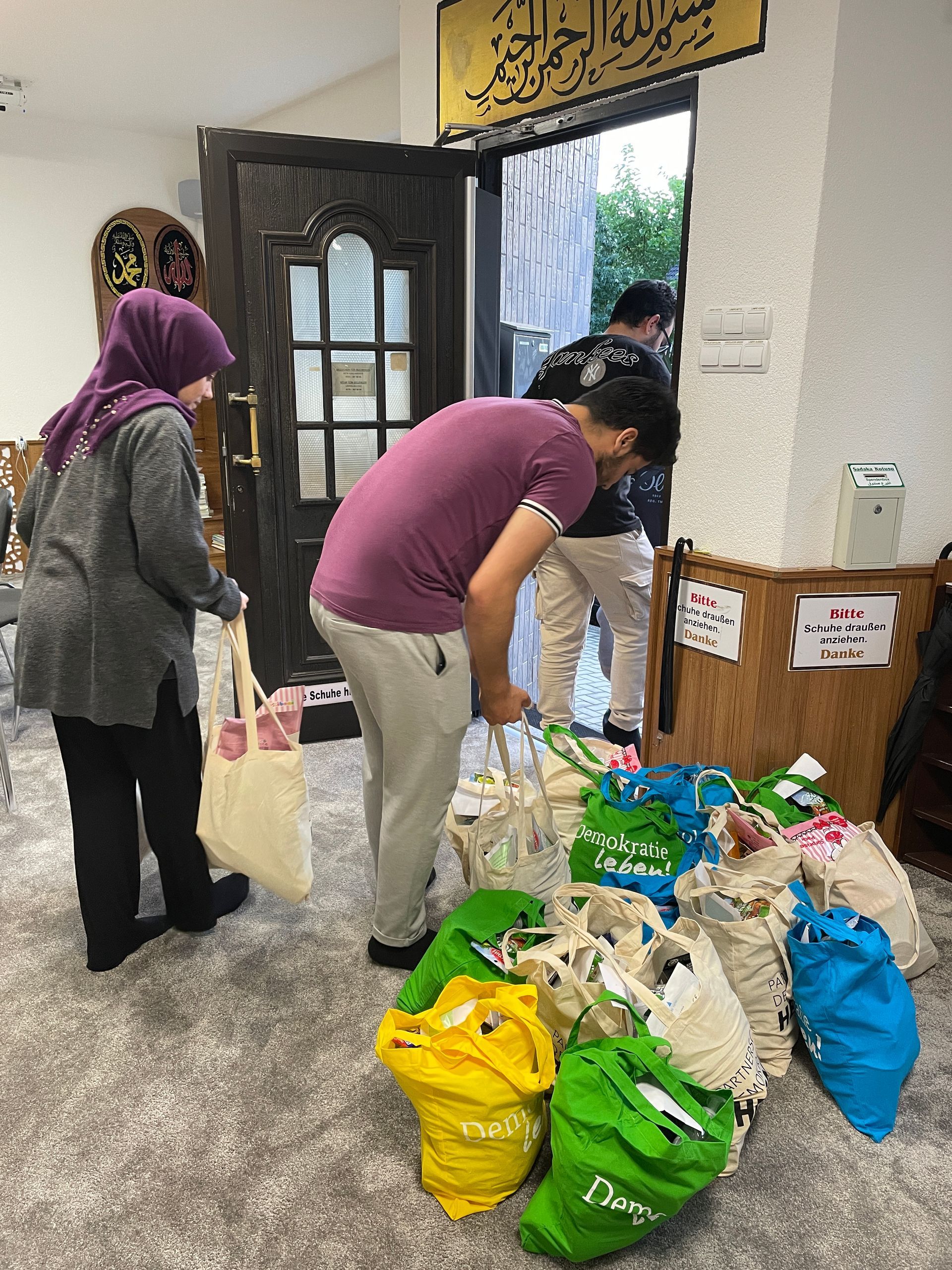 Dieses Jahr gestalteten wir unseren Tag der offenen Moschee anders. Da vor kurzem der Prophet Mohammed Geburtstag hatte, starteten wir genau so wie im letzten Jahr, eine Hilfsaktion. Dafür füllten wir Stofftüten von der PfD Herne und „Demokratie Leben!“ unter anderem mit Grundnahrungsmitteln und Hygieneartikeln.