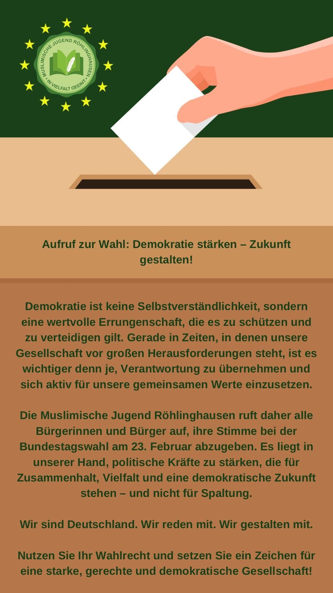 Die Muslimische Jugend Röhlinghausen ruft daher alle Bürgerinnen und Bürger auf, ihre Stimme bei der Bundestagswahl am 23. Februar abzugeben. Es liegt in unserer Hand, politische Kräfte zu stärken, die für Zusammenhalt, Vielfalt und eine demokratische Zukunft stehen - und nicht für Spaltung.
