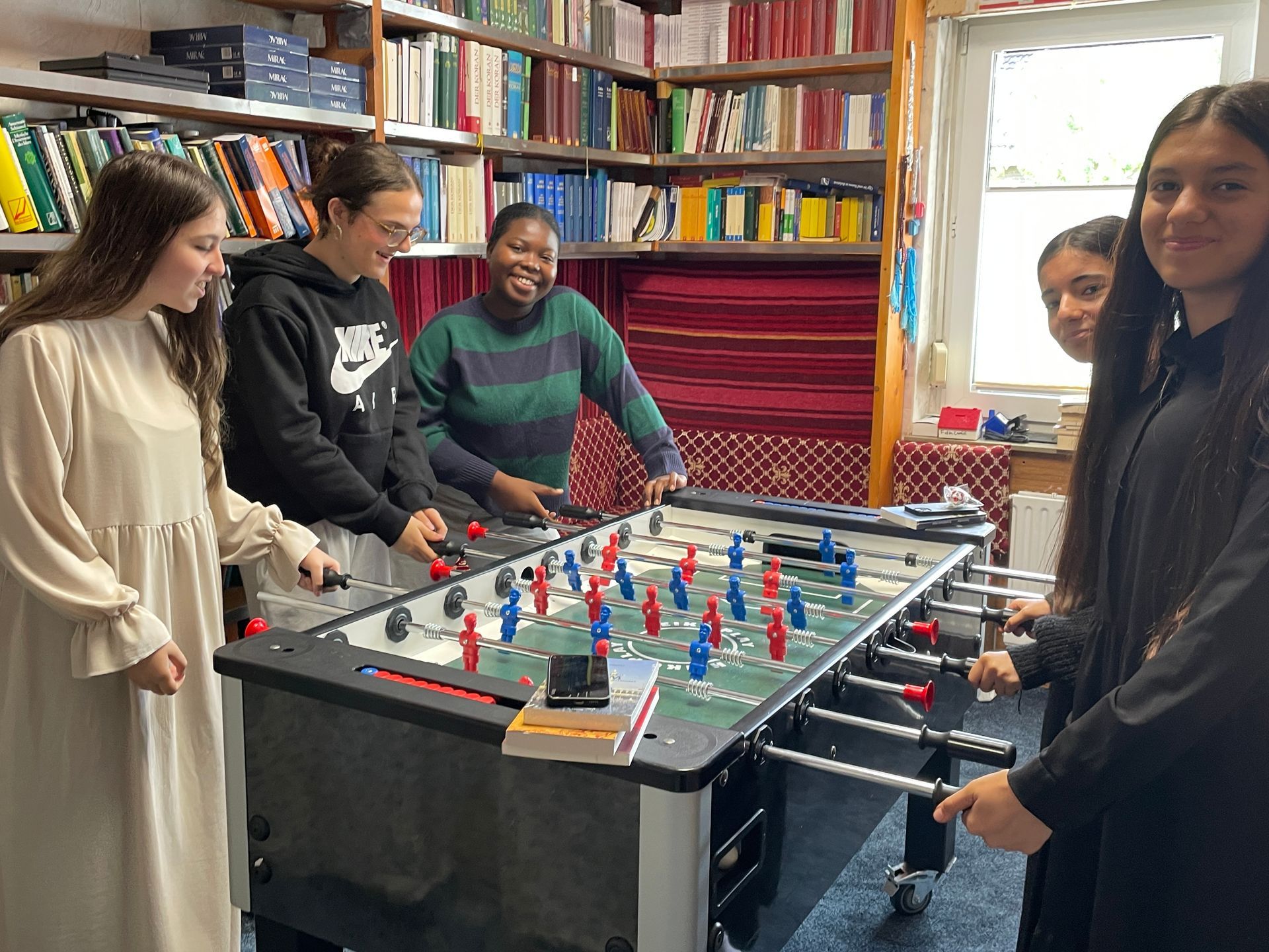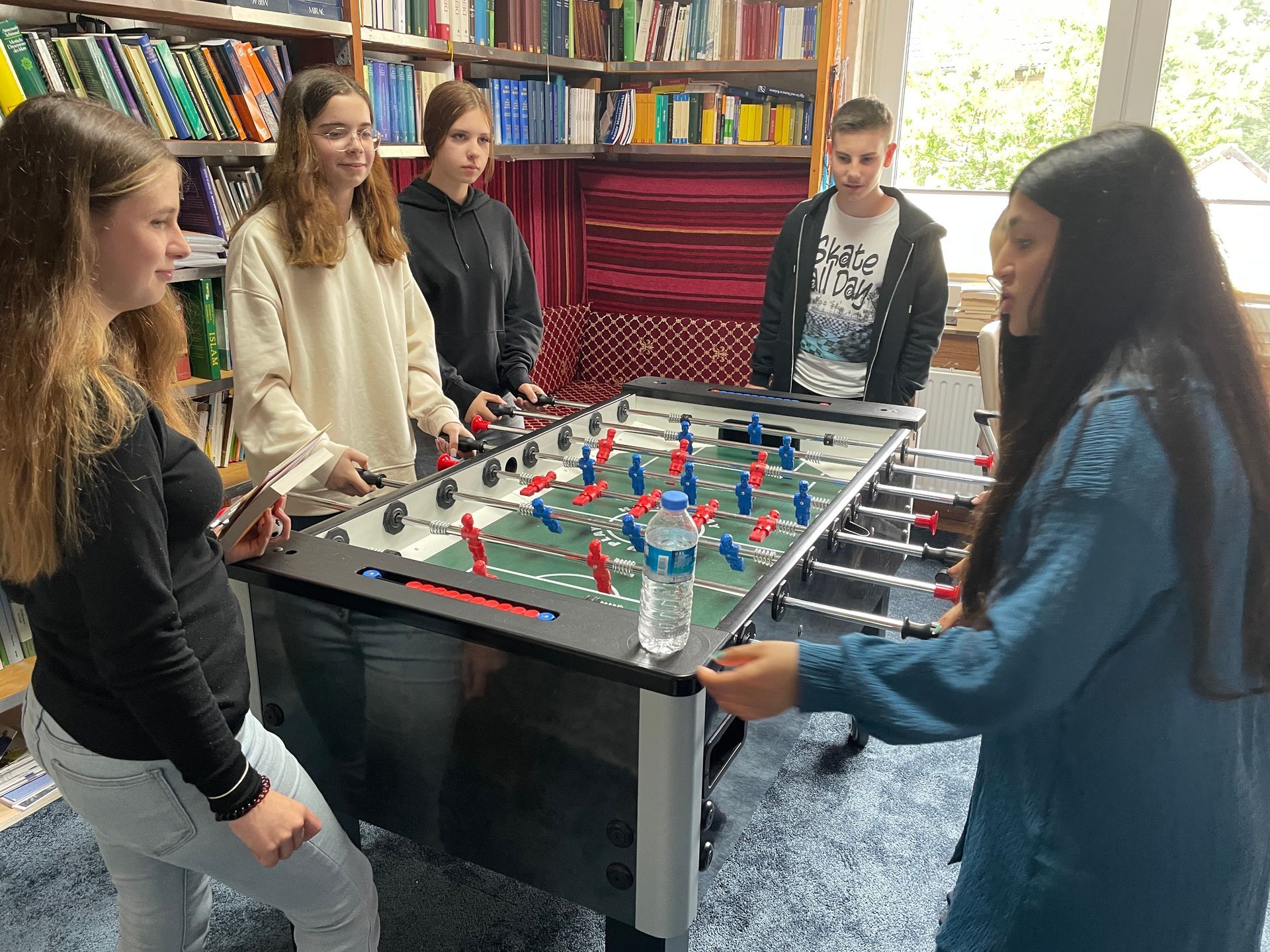 Zum Abschluss gab es für die Schüler:innen viel Lesestoff und kleine Erinnerungsgeschenke. In der Zwischenzeit konnten sie auch Fußball, Kicker und Tischtennis spielen.
