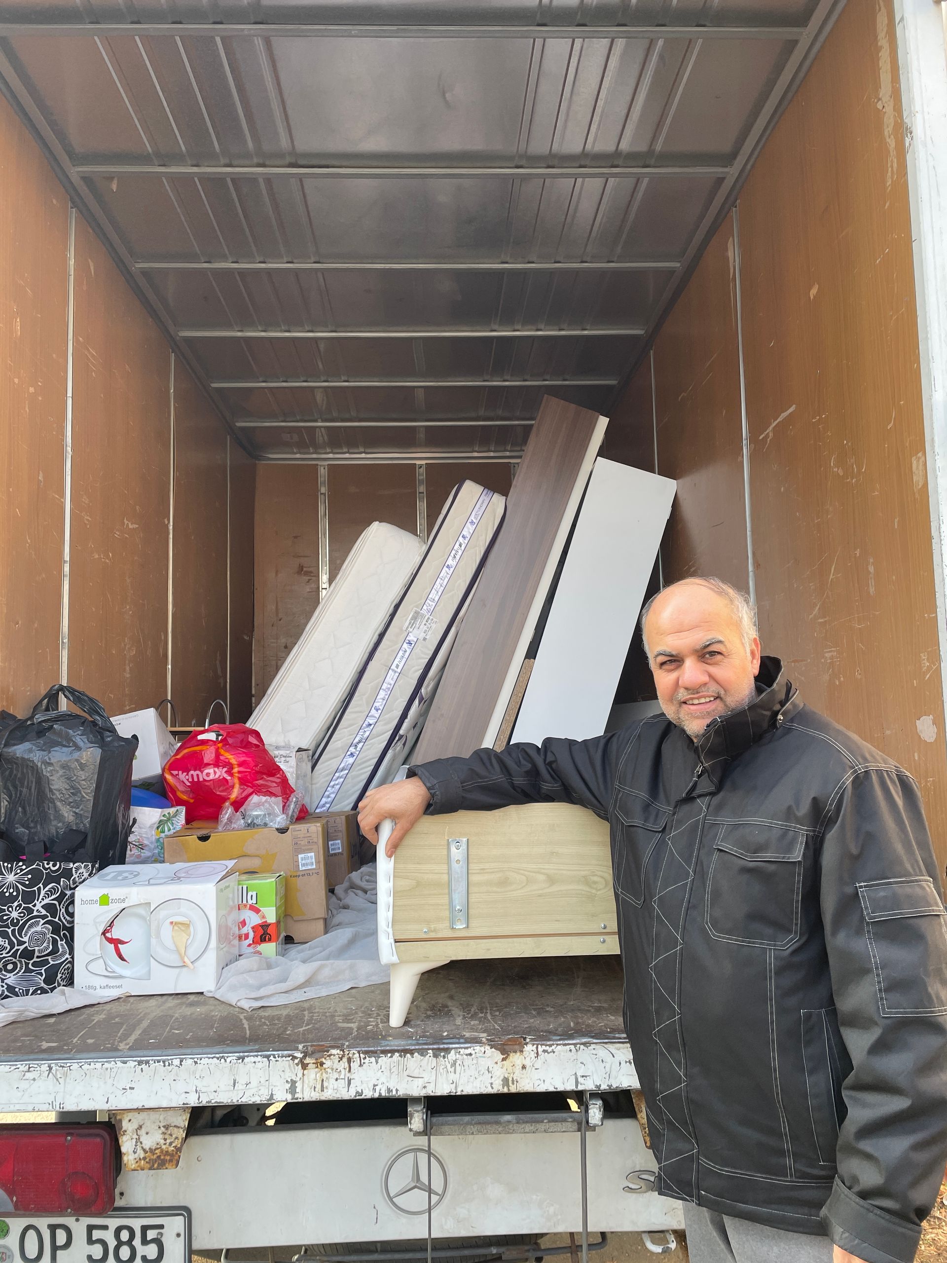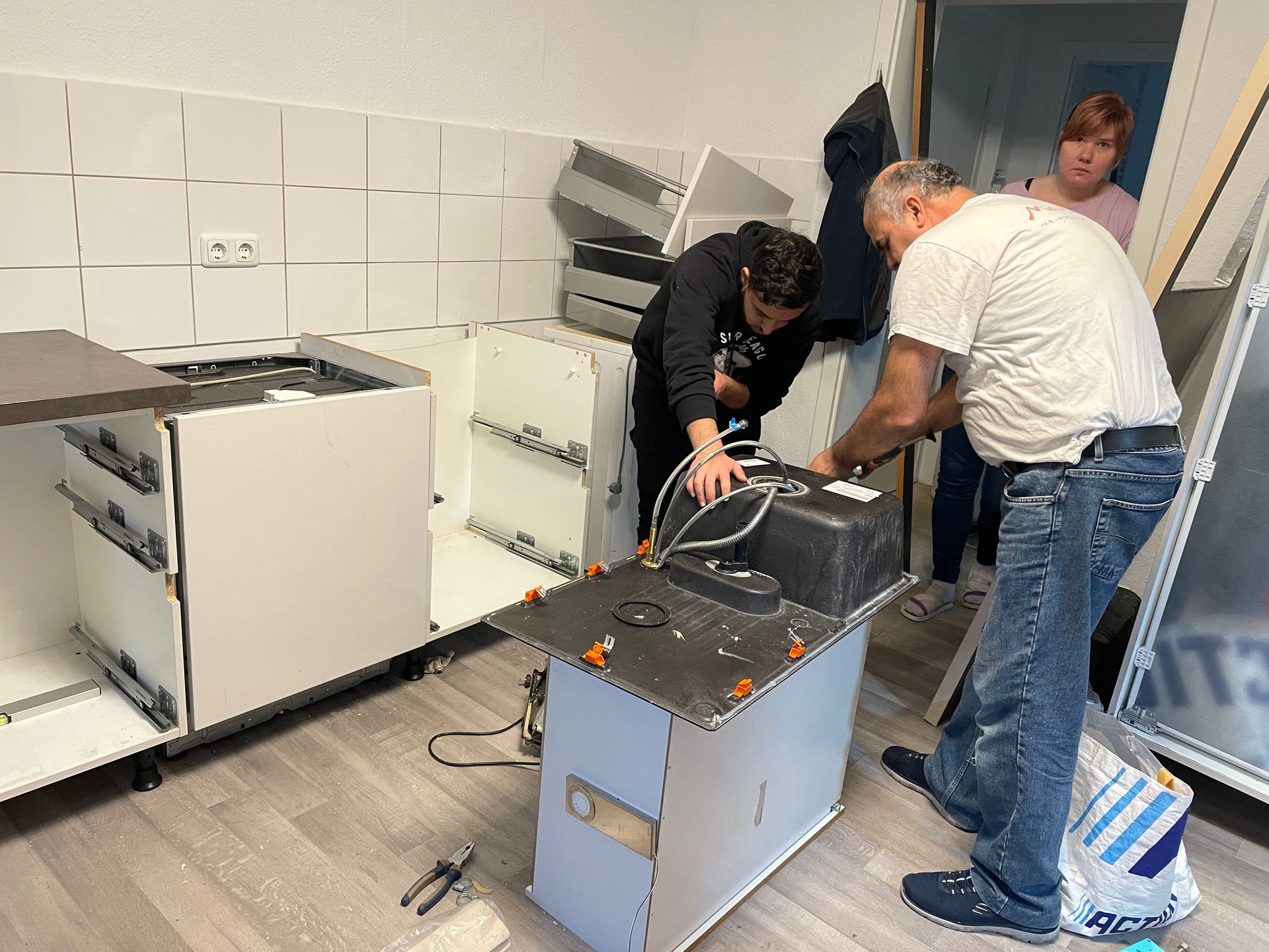 Schließlich mussten die ganzen Möbel getragen und aufgebaut werden. An dieser Stelle kommen, wie immer, unsere Jugendlichen ins Spiel. In ein paar Stunden wurde alles in die Wohnung getragen. Den Aufbau übernahm Salih Alawad. Er floh 2015 aus Syrien und engagiert sich seitdem in der Gemeinde. Jetzt hilft er ukrainischen Geflüchteten beim Aufbau und der Montage ihrer Möbel.