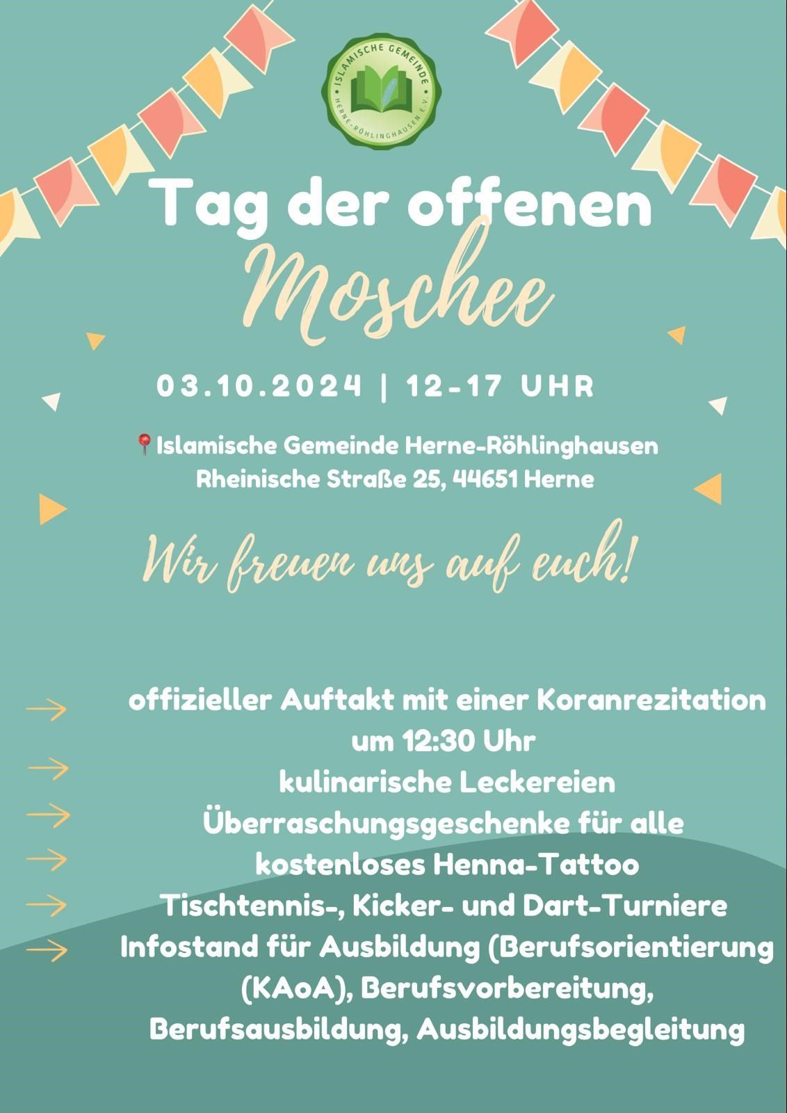 Hast du dich schon einmal gefragt, ob du einfach so eine Moschee besuchen darfst? Wenn ja, dann haben wir tolle Neuigkeiten für dich. Am 03.10.2024 - am Tag der deutschen Einheit - öffnen Moscheen in Deutschland ihre Türen. Auch wir, die Islamische Gemeinde Herne-Röhlinghausen, heißen euch wieder herzlich willkommen!