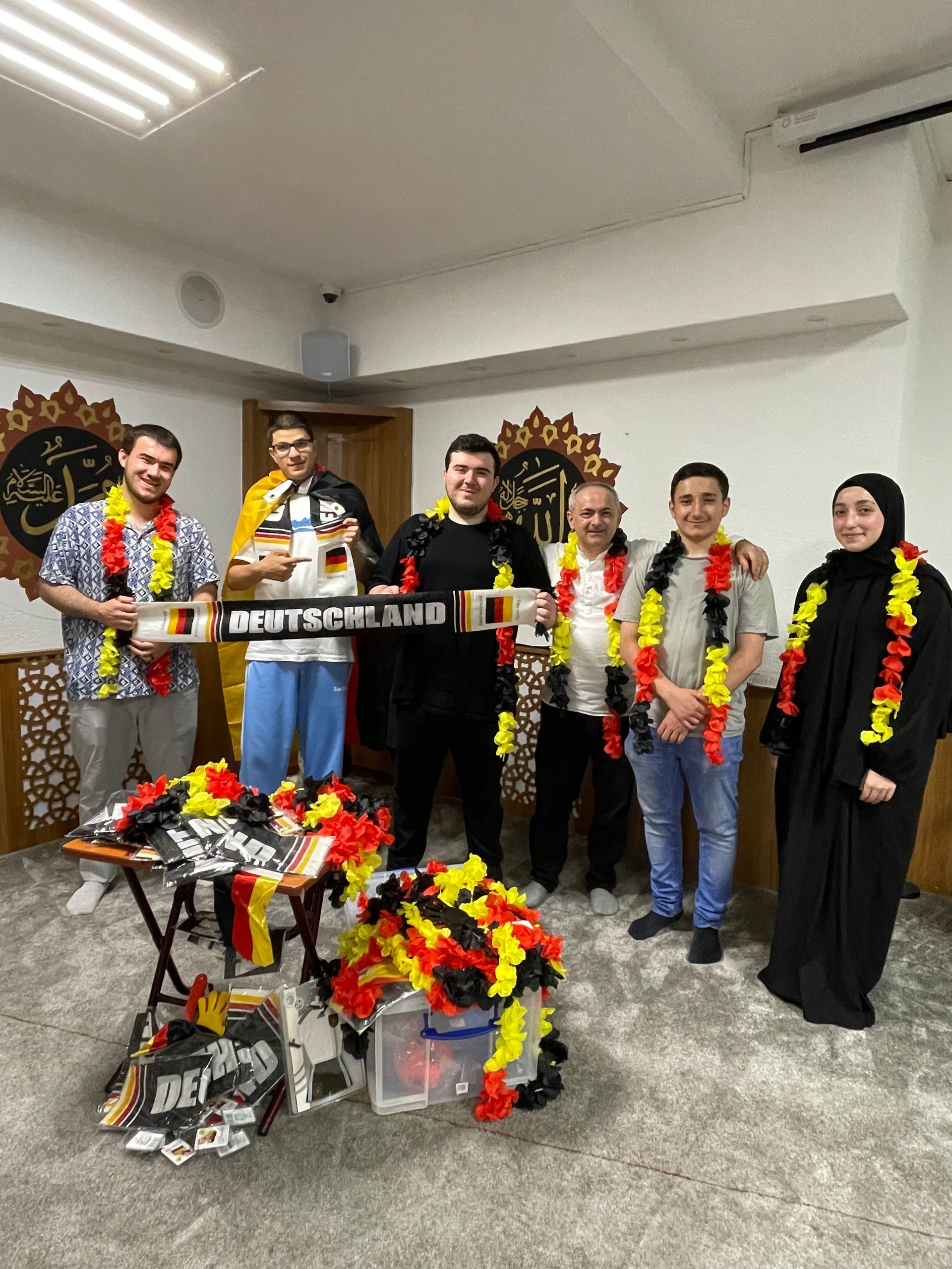Die deutsche Nationalmannschaft verbindet uns besonders jetzt im Achtelfinale. Wir können stolz darauf sein, dass sich die Vielfalt Deutschlands auch in unserer Nationalmannschaft widerspiegelt. Die muslimische Jugend Röhlinghausen verschenkt passend zum Achtelfinale Deutschland-Fanartikel, darunter Schals und Blinker in verschiedenen Ausführungen.