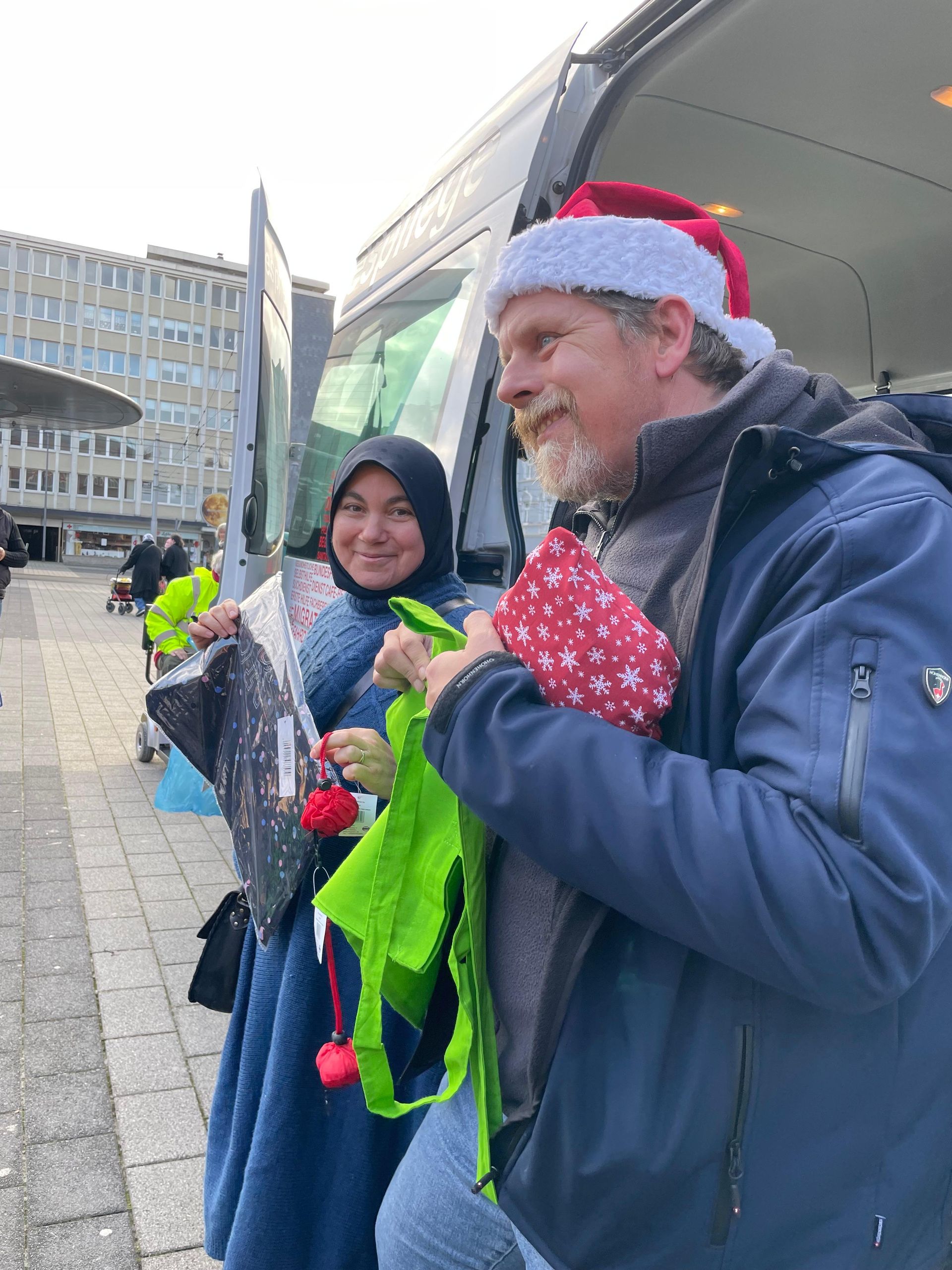 Ausgestattet mit Schals und Einkaufstüten mit Tiermotiven machten sie den Besucher:innen des Suppenbusses eine Freude zur Weihnachtszeit.