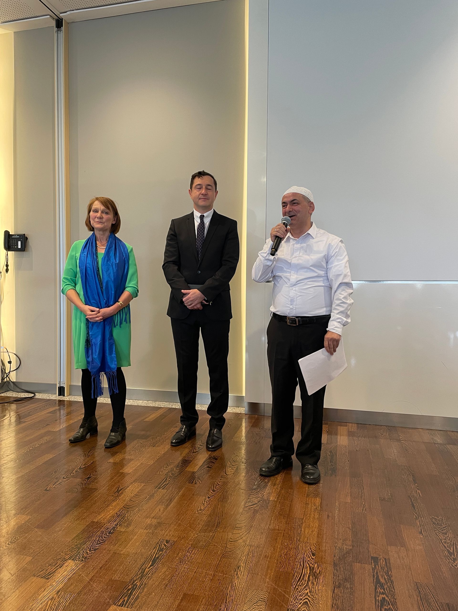 Nach einer Begrüßung mit „Schalom“, „Selamunaleykum“ und „Friede sei mit euch“, las Herr Krimmhand aus der hebräischen Thora, während Herr Nazik aus dem Koran die Sure Al-Isra rezitierte.