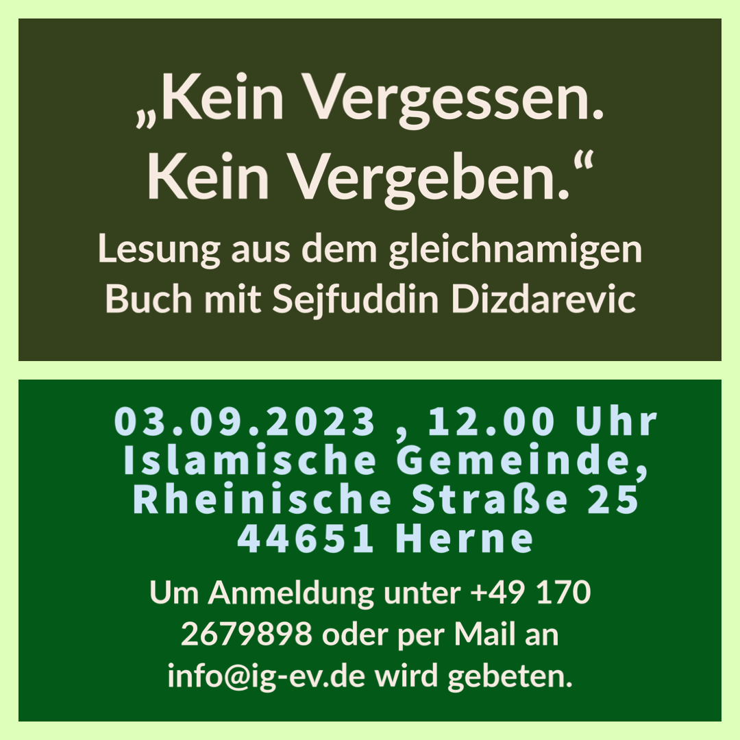 Am 03.09.2023 wird Sejfuddin Dizdarevic in den Räumlichkeiten der Gemeinde aus seinem Buch „Kein Vergeben. Kein Vergessen.“ vortragen.