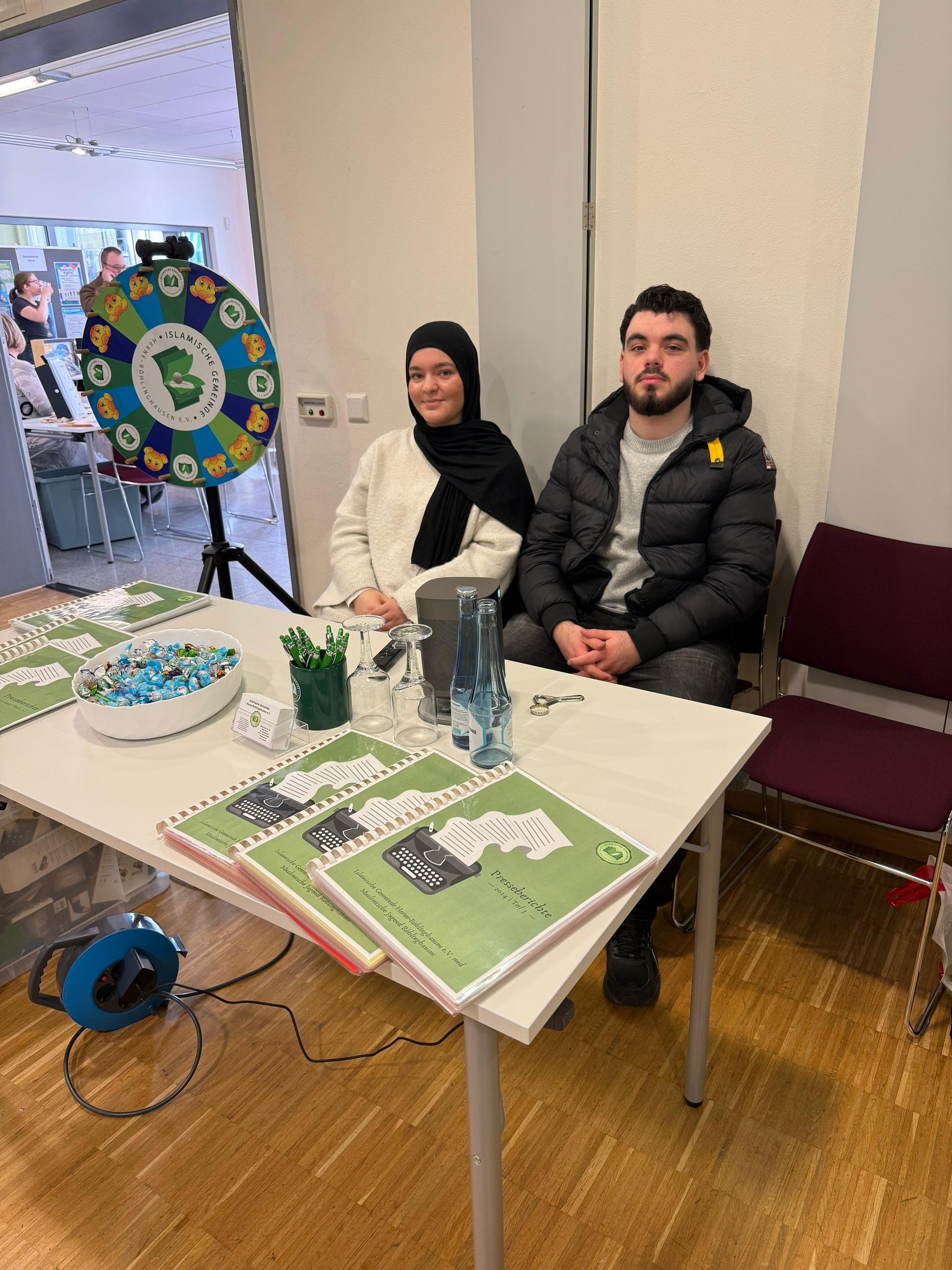 07.02.2026, Herne - Die Islamische Gemeinde Röhlinghausen nahm am ersten Pluto-Familienfest im gleichnamigen Stadtteilzentrum teil. Vertreten wurde sie dabei von den Mitgliedern der Muslimischen Jugend Röhlinghausen Elyesa, Nida, Musab und Berat. Die Gemeinde bot einen Infostand und ihr allseits bekanntes Glücksrad an. Zudem gab es kostenlose Süßigkeiten. Im Hintergrund des Standes liefen währenddessen verschiedene Presse- und Videoauftritte der Gemeinde.