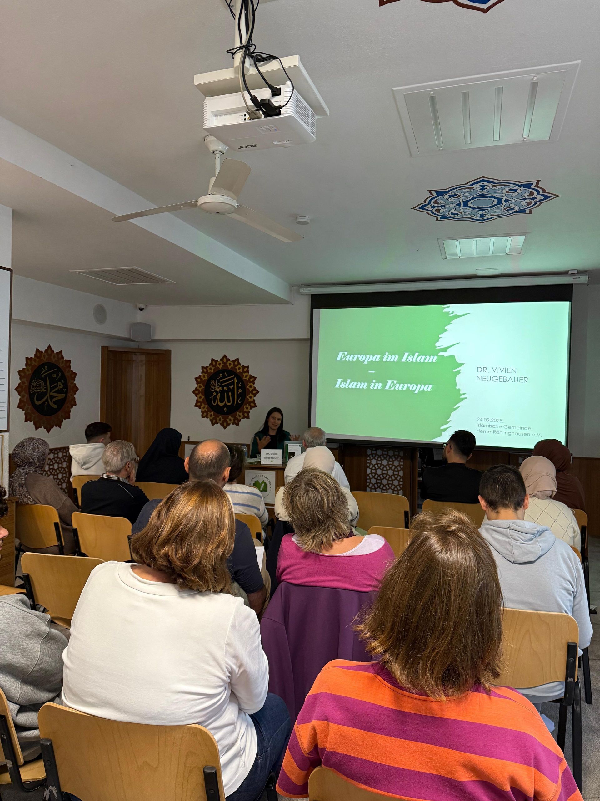 24.09.2025, Herne - Dr. Neugebauer, die sich in ihrem Vortrag stärker auf den Teil „Islam in Europa“ fokussierte, referierte vor knapp 25 Personen über die Entwicklung islamischer Präsenz in Europa.