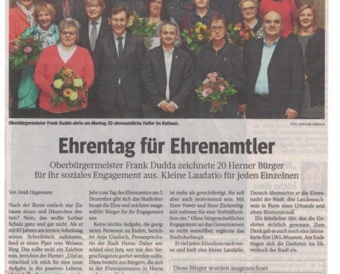 Oberbürgermeister Dr. Frank Dudda hat am Montag, 5. Dezember 2016, 20 Herner Bürgerinnen und Bürger geehrt, die sich ehrenamtlich engagieren. Sie sind mit einer Beschreibung ihres bürgerschaftlichen Engagements zur Nominierung und Auszeichnung vorgeschlagen und letztlich von einer Jury aus 41 Einsendungen ausgewählt worden. Die Geehrten sind:
