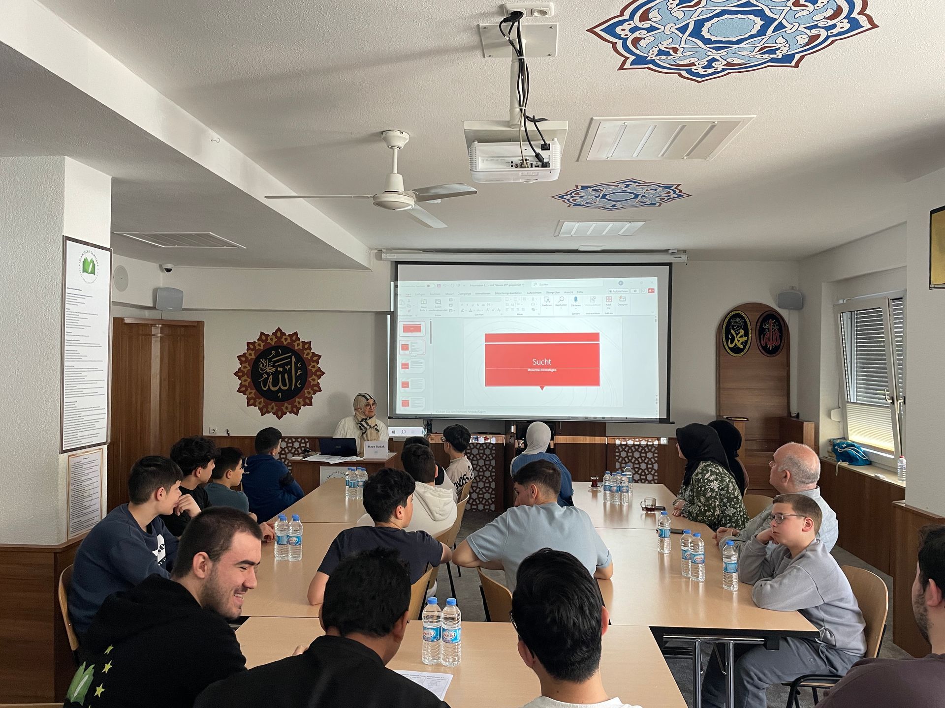 02.04.2025, Herne - Die Soziologin und Suchtpädagogin Hava Budak erklärte den überwiegend jungen Zuhörer:innen die verschiedenen Formen von Sucht, deren Ursachen sowie Wege zur Prävention und Hilfe. Zwischendurch konnten immer wieder Fragen gestellt werden.