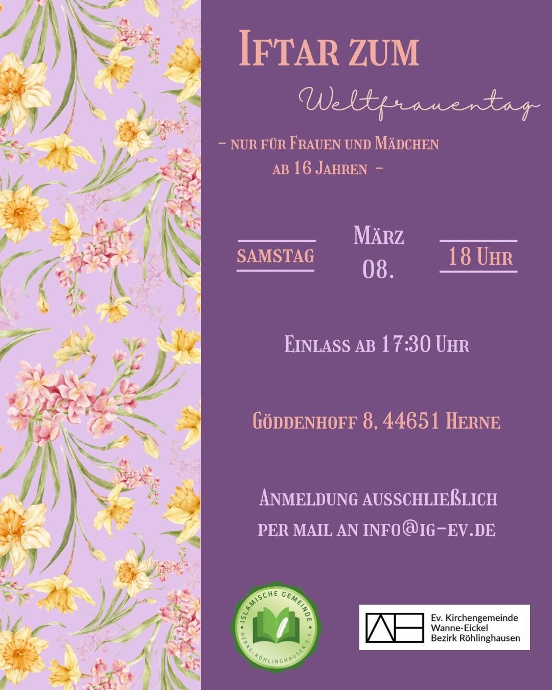 Wir laden euch herzlich ein, mit uns den Weltfrauentag in Kombination mit einem Fastenbrechen zu feiern. Organisiert wird das Essen von der Islamischen Gemeinde Röhlinghausen und der Evangelischen Kirchengemeinde Röhlinghausen.